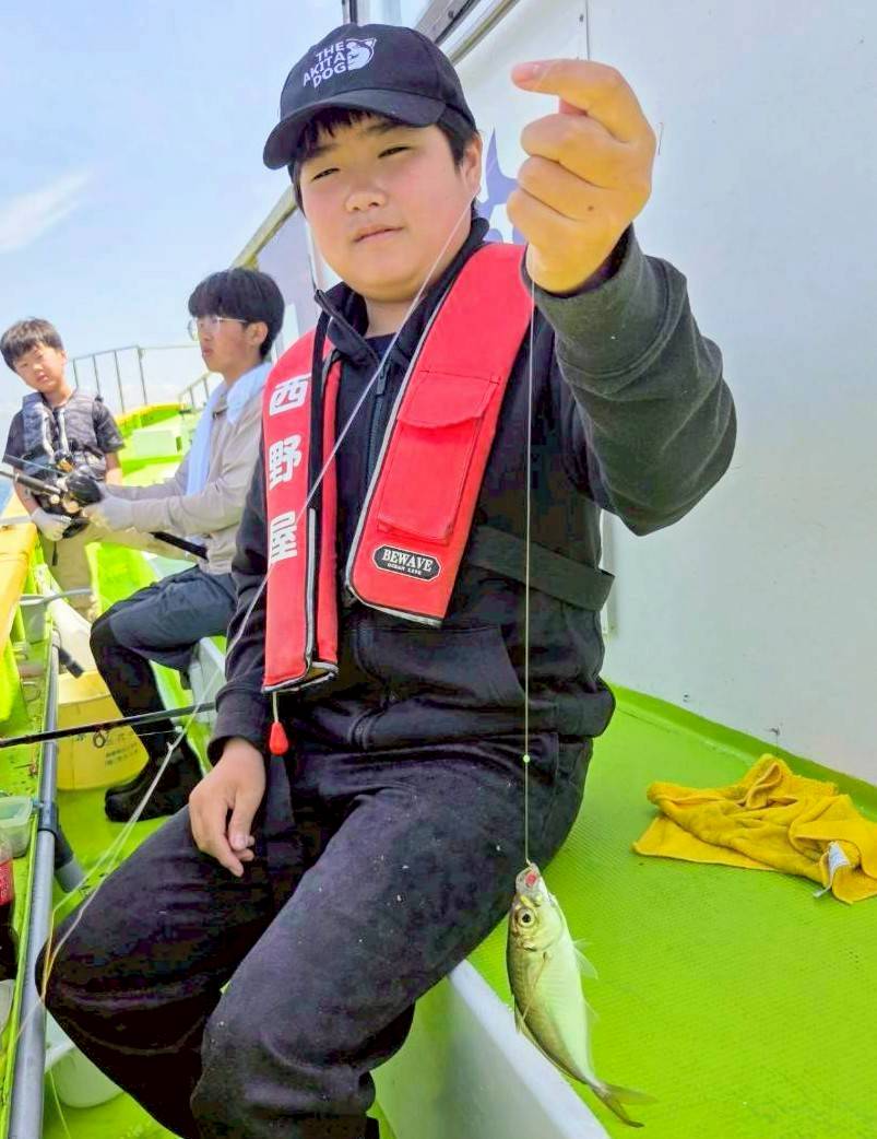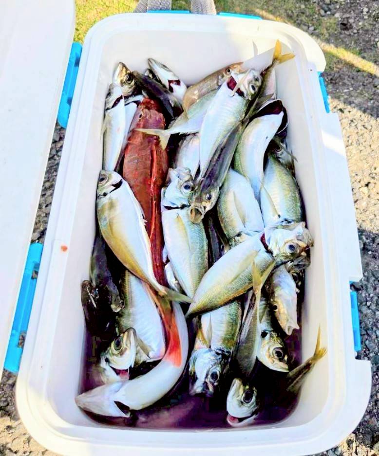 11時で終了しLTアジにチェンジ!釣り場でイカリをおろし11時30分からスタート!初めは底の反応でしたが、コマセが効いてくると反応も盛り上がり中小混じりでバリバリと(^_^)vそのまま14時の納竿まで釣れ続き、実釣2時間半で平均40匹台、トップ60匹、小学生で初挑戦のお子さんも23匹と大健闘でした(^^)d